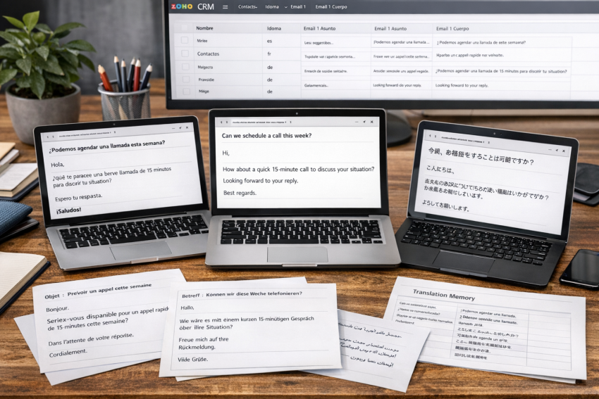 How can you apply this to Zoho CRM without complicating things? The idea is to treat your messages (subjects and bodies) as ‘exportable content’. Many companies follow a simple workflow: they extract the text from their library (or from a structured sheet) with an identifier for each message; they translate the content using translation memory–compatible tools; and they reimport the translated versions into Zoho, letting the system populate the final fields based on the contact’s preferred language. This way, when you update a base text, the process detects repeated content, reducing the effort required.